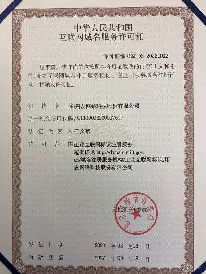 2022年3月24日,北京市通信管理局为用友网络科技股份有限公司颁发工业互联网标识注册服务机构许可证。北京市通信管理局党组成员、纪检组长、二级巡视员朱春霞,北京市通信管理局信息通信管理处处长徐星代表发放,用友网络科技股份有限公司副总裁郝伟明、精智工业互联网事业部总经理张友明代表用友接收许可。