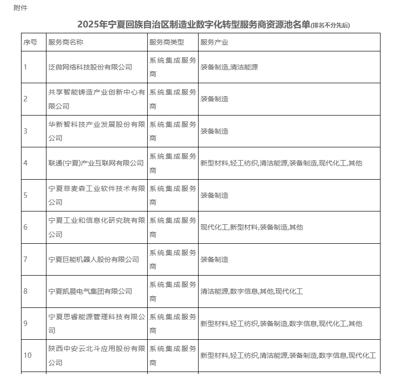 为深入贯彻落实工业和信息化部《制造业企业数字化转型实施指南》和《自治区深入推进数字化转型行动方案》精神,根据《宁夏回族自治区工业和信息化厅关于征集制造业数字化转型服务商的通知》要求,经服务机构自主申报、专家评审及综合评议等程序,现确定2025年度自治区制造业数字化转型服务商资源池名单(详见附件),并予以公布。我们将加强服务商管理工作,适时动态调整。请各入选单位持续提升技术服务能力和水平,积极为区内工业企业提供适用性强、实效性高的数字化转型解决方案与专业化服务。请各地结合本地产业发展实际,加大对入选资源池服务商及其典型解决方案的宣传及推广,促进合作,推动数字化转型场景落地应用。