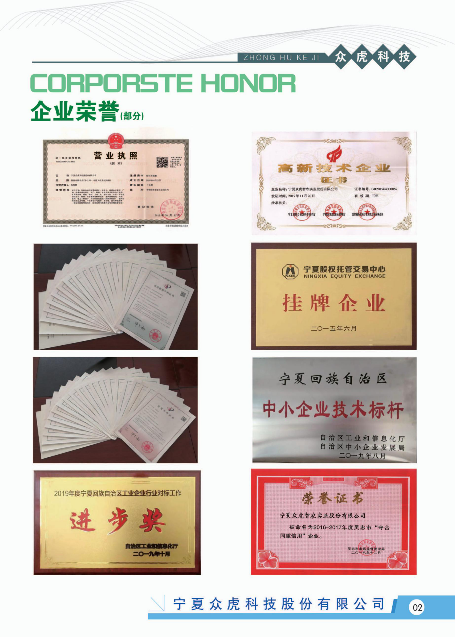 公司是宁夏科技厅认定的科技型中小企业,国家级高新技术企业,截止目前,公司取得了26项科技成果专利,其中发明专利3项,实用新型专利23项,成果转化首(台)套装备1套。2010年以来,公司被宁夏吴忠市人民政府评为“守合同、重信用”企业,被建设银行宁夏分行评为“AAA级信用企业”和“信贷诚信企业”,2018年、2019年公司被自治区工信厅分别评为“专精特新”配套标杆企业,“专精特新”技术标杆企业、自治区服务型制造示范企业。公司取得宁夏行业对标工作进步奖,是宁夏股权托管交易中心新三板挂牌企业、中国物联网会员单位、中国农机协会会员单位。